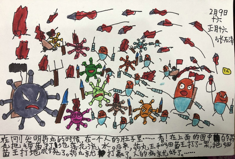 作品名稱:《藥丸與病毒的大決戰(zhàn)》 作者:喻筱欽 年齡:5歲