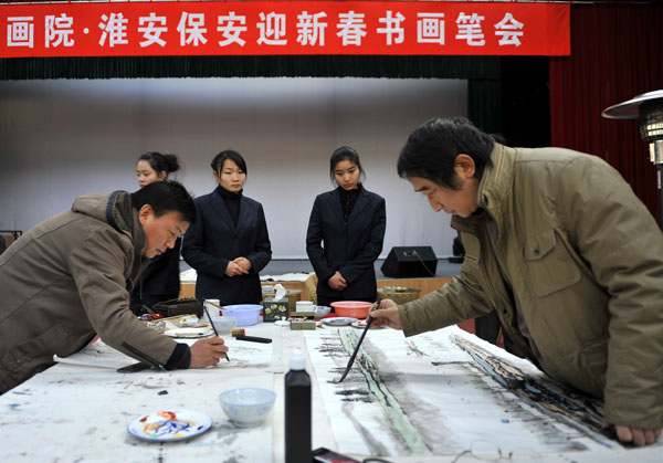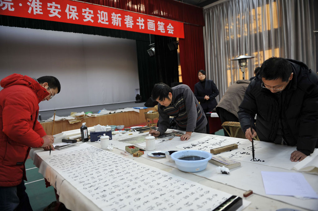 元月16日下午,由淮安書畫院和總公司聯(lián)合舉辦的“迎新春書畫筆會”活動(dòng)在公司活動(dòng)中心舉行。公司總經(jīng)理婁伯翱、副總經(jīng)理王克、徐文剛和各部門負(fù)責(zé)人蒞臨活動(dòng)現(xiàn)場,部分保安隊(duì)伍和押運(yùn)隊(duì)伍中的書畫愛好者到現(xiàn)場觀摩學(xué)習(xí)。會上,書畫們齊集一堂,創(chuàng)作了一幅幅書畫精品,彰顯了保安文化特色,贏得了在場觀摩者們的贊賞與好評。