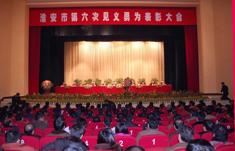 12月24日上午,我市在淮安人民大會堂召開第六次見義勇為表彰大會,對全市58名見義勇為先進(jìn)個(gè)人進(jìn)行表彰。會議由市委常委、秘書長、常務(wù)副市長陳洪玉主持,副市長、公安局長倪興余宣讀了《市政府關(guān)于表彰見義勇為先進(jìn)個(gè)人的通報(bào)》,市見義勇為基金會理事長李繼堯宣讀了《市見義勇為基金會關(guān)于給唐子年等同志頒發(fā)獎(jiǎng)金和撫恤金的決定》,兩名見義勇為先進(jìn)個(gè)人代表在會上發(fā)言,市委書記劉永忠同志到會并作重要講話。市政協(xié)主席王維凱,市人大代理主任范學(xué)恕,市局副局長徐乾,市局黨委委員、政治部主任王國慶及各縣(區(qū))委、政府、市經(jīng)濟(jì)開發(fā)區(qū)管委會分管負(fù)責(zé)人,公安(分)局局長、政委,市法院、檢察院分管負(fù)責(zé)人;市委各部委辦、市各委辦局、市各直屬單位、部省屬駐淮單位、市各大中專院校分管負(fù)責(zé)人,部分大中專院校學(xué)生以及市各新聞單位的記者共1500人參加了會議。