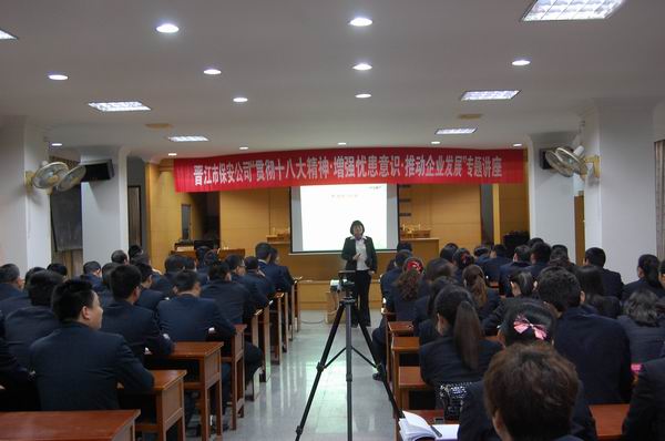 本網(wǎng)-福建省晉江市保安服務(wù)公司消息(通訊員 歐陽(yáng)長(zhǎng)青) 為進(jìn)一步適應(yīng)日益激烈的市場(chǎng)競(jìng)爭(zhēng),切實(shí)推動(dòng)企業(yè)持續(xù)發(fā)展,3月27日-28日,公司結(jié)合“增強(qiáng)憂患意識(shí),推動(dòng)長(zhǎng)遠(yuǎn)發(fā)展”大討論活動(dòng),舉辦“貫徹黨的十八大精神·增強(qiáng)憂患意識(shí),推動(dòng)企業(yè)發(fā)展”專題講座。晉江市委黨校副教授吳蓮妹應(yīng)邀前來(lái)授課。保安公司領(lǐng)導(dǎo)吳輝表、各部門(mén)經(jīng)理、工作人員等100多人聆聽(tīng)了講座。