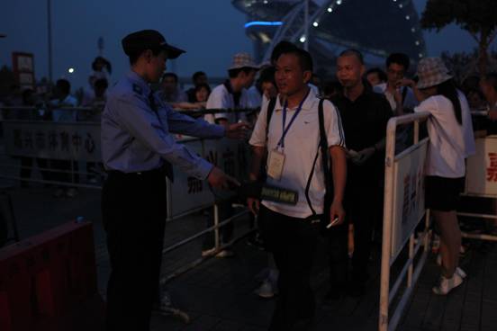 圖為:開幕式正式開始前,各出入口隊(duì)員做好安檢工作