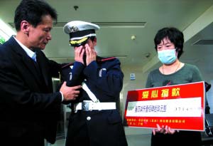 昨日15時,記者在人民醫(yī)院住院部12層病房外見到了小悅悅的父母。剛從小悅悅病房里走出的小悅悅母親孫女士戴著口罩,無助的眼神里流露出了希望,小悅悅的父親于景輝則身穿保安員制服。華信中安保安公司的工作人員為夫妻兩人送來了37149元捐款(見圖)?!氨0矄T們自發(fā)捐款,有的10元,有的20元?!北0补镜呢?fù)責(zé)人殷衛(wèi)宏說。