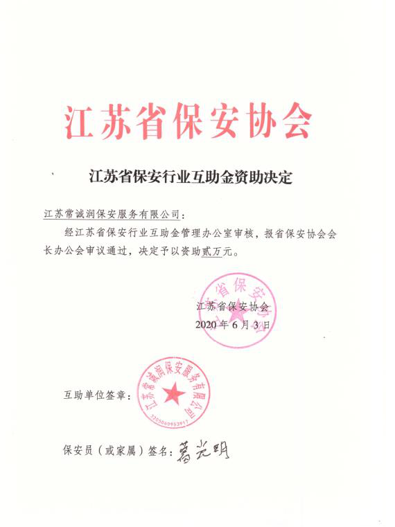 2019年5月,江蘇省保安協(xié)會針對保安行業(yè)工資待遇低、素質(zhì)能力低、社會地位低、流失率高“三低一高”現(xiàn)象,通過探索建立最低用工成本制度、開展保安服務(wù)公司等級評定、組織全省保安職業(yè)技能競賽等措施改善保安行業(yè)營商環(huán)境、提升保安隊(duì)員素質(zhì)能力、樹立保安隊(duì)伍良好形象的同時,借鑒提煉企業(yè)經(jīng)驗(yàn)做法并經(jīng)反復(fù)調(diào)研論證,制定出臺了《江蘇省保安行業(yè)互助金管理辦法(試行)》和《江蘇省保安行業(yè)互助金管理細(xì)則(試行)》,堅(jiān)持自愿、平等、互惠原則,采取保安企業(yè)出資、保安隊(duì)員受益方式,對因工傷亡、大病特困保安隊(duì)員進(jìn)行撫恤資助。2020年1月10日互助金繳存資助工作啟動以來,已有232家保安服務(wù)公司自愿加入互助單位、在職保安隊(duì)員13萬余人。除江蘇常誠潤保安服務(wù)有限公司保安員葛光明外,還有13家保安服務(wù)公司為15名保安員提出資助申請,相關(guān)審核工作正在有序推進(jìn)。