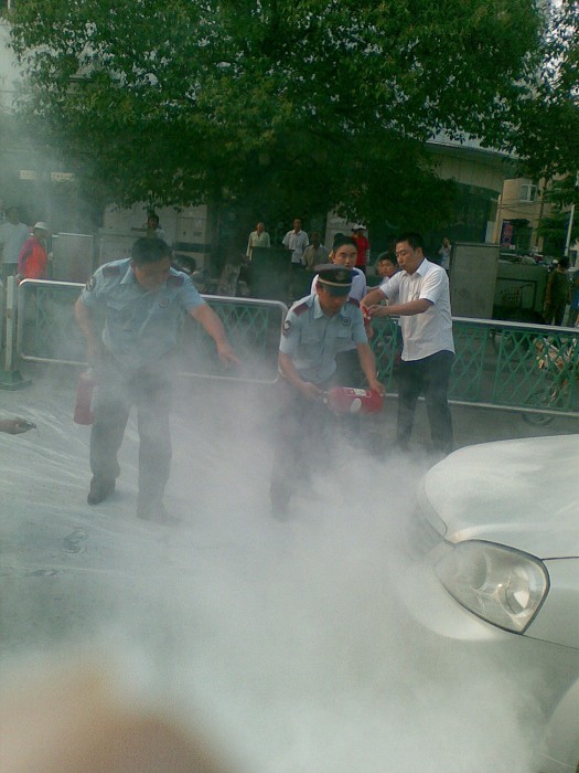 當(dāng)天,健康東路上一輛蘇AV486白色別克轎車在行駛至市財(cái)政局門前時(shí)車頭突然冒煙,隱約有明火竄出,引來路邊很多市民圍觀,正在市財(cái)政局開會(huì)的保安大隊(duì)長薛松發(fā)現(xiàn)后,立即帶隊(duì)員尚月龍?zhí)嶂鴾缁鹌髭s到現(xiàn)場,一邊疏散周圍路人和過往車輛。一邊用滅火器進(jìn)行撲救,由于撲救及時(shí),該車損失不大。
