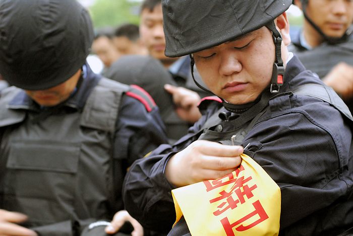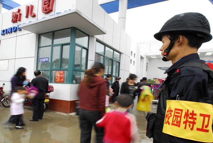 2010年5月5日早晨6時許,全副武裝的校園特衛(wèi)人員整裝待發(fā)。自當日起,江蘇省淮安市首批46名配備鋼盔、防刺服、防割手套、防暴膠棒、滅火槍、催淚器等防護裝備的專職校園特衛(wèi)人員開始進駐市直23所中小學和幼兒園,守護校園平安。這些人員都是從全市保安隊伍中精選出來的骨干,年齡在35歲以下,大都有部隊服役的經歷,身體素質和政治素質較好,且受過專業(yè)訓練。