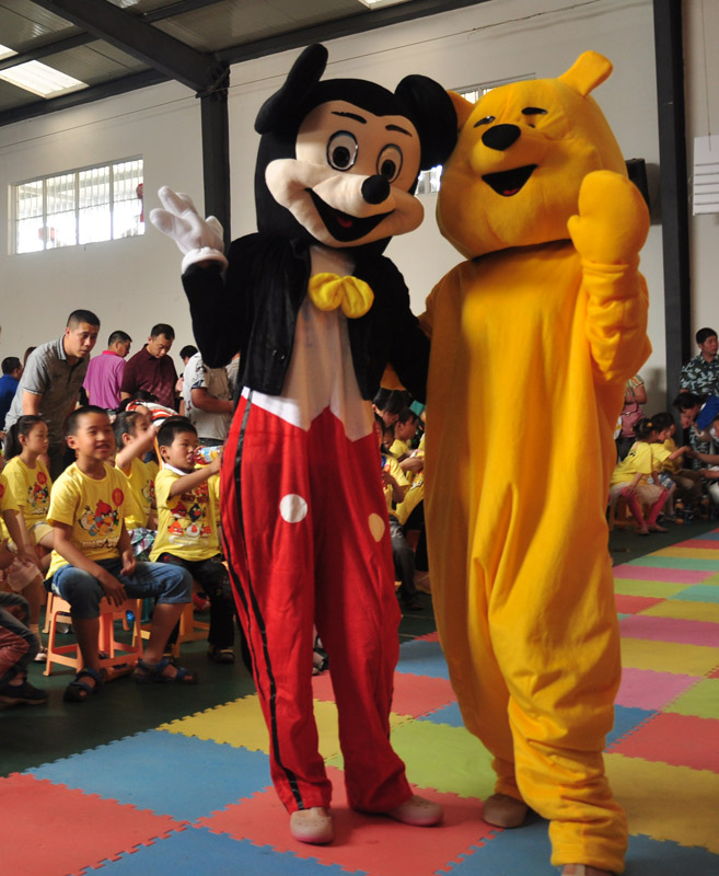 下午兩點,活動中心內(nèi),播放著一首首兒童歌曲,卡通人物喜羊羊、美羊羊、紅太郎、灰太狼、維尼小熊等在場內(nèi)和孩子們愉快的做著小游戲。每個到場的孩子憑著入場券在場內(nèi)領取了一件黃色的卡通T恤衫,還有食品和飲料。