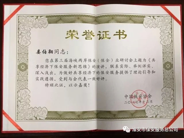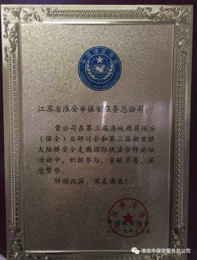 2018年,淮安市保安服務(wù)總公司受到中國保安協(xié)會表彰,贊其積極參與第三屆海峽兩岸保安(保全)業(yè)研討會和第三屆新亞歐大陸橋安全走廊國際執(zhí)法合作論壇活動,并貢獻(xiàn)卓絕。