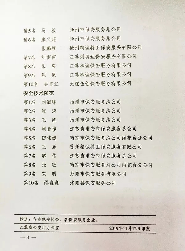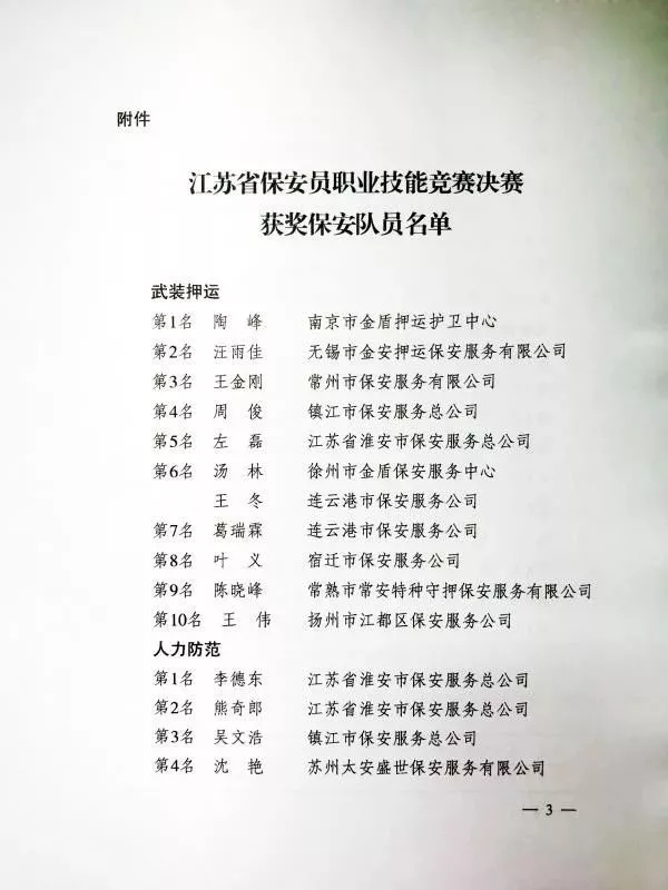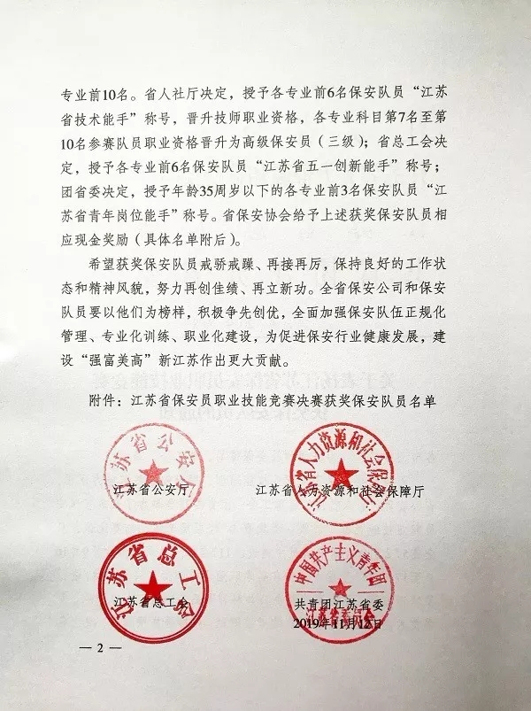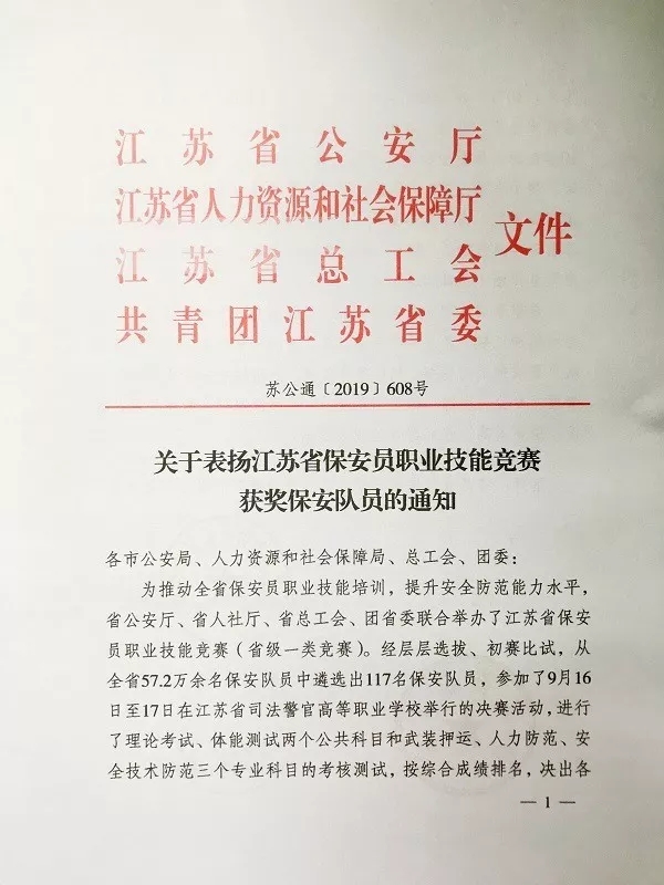 11月12日,江蘇省公安廳、江蘇省人力資源和社會保障廳、江蘇省總工會、共青團(tuán)江蘇省委聯(lián)合發(fā)文,祝賀、表揚(yáng)獲獎保安員,并對各科目進(jìn)入前六名的獲獎人員分別授予“江蘇省技術(shù)能手”、“江蘇省五一創(chuàng)新能手”和“江蘇省青年崗位能手”榮譽(yù)稱號。