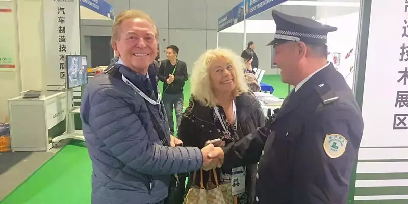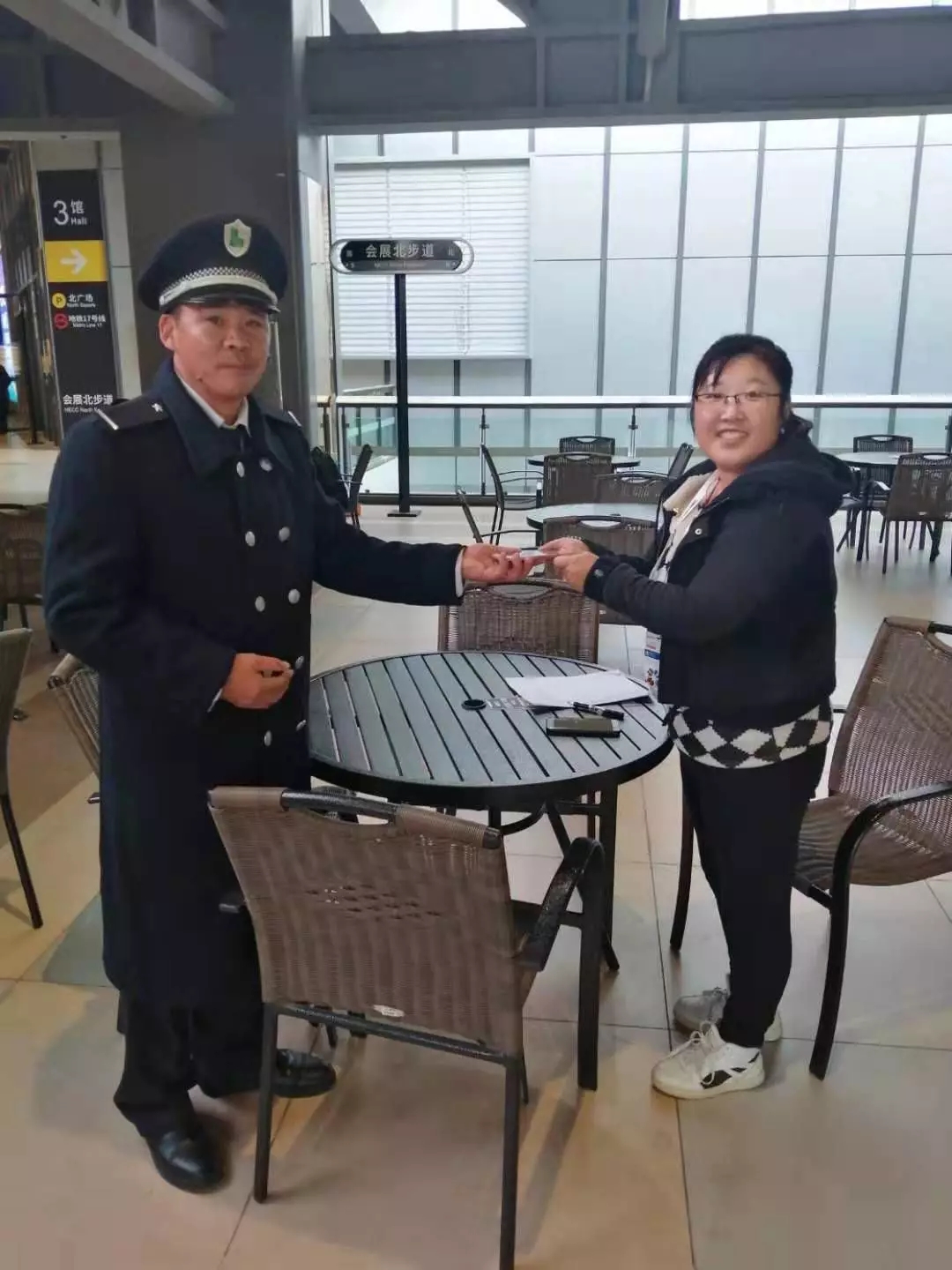 12月3日開館當(dāng)天,隊(duì)員陳得彬在6.1號(hào)館3門巡查時(shí)拾到一部手機(jī),經(jīng)過尋找手機(jī)是兩位英國夫婦的,外國友人對(duì)陳得彬非常感謝,希望拍照紀(jì)念,臉上流露出滿意笑容。