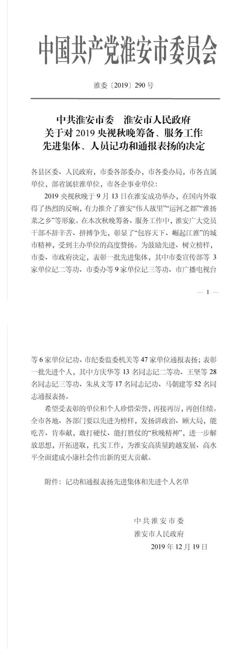 日前,淮安市委市政府發(fā)文對(duì)2019央視秋晚籌備和服務(wù)工作中涌現(xiàn)出來(lái)的先進(jìn)集體和先進(jìn)個(gè)人進(jìn)行通報(bào)表?yè)P(yáng),總公司獲先進(jìn)集體,王廣衛(wèi)同志獲先進(jìn)個(gè)人,并被通報(bào)表?yè)P(yáng)。今年9月在淮安舉辦的央視中秋晚會(huì),舉國(guó)關(guān)注,舉世矚目,淮安保安講政治、講大局,舉全公司之力,集全公司之智,眾志成城、戮力同心、創(chuàng)新舉措、壓實(shí)責(zé)任,自8月9日起至10月9日,從晚會(huì)設(shè)備進(jìn)場(chǎng)、舞臺(tái)搭建、彩排聯(lián)排、錄播直播直至設(shè)備拆除,累計(jì)投入安保力量8000余人次,各類高科技安保裝備20余種,保障車(chē)輛580余輛次,圓滿完成了巡邏守護(hù)、安全檢查、科技保障、搜毒搜爆、無(wú)人機(jī)管控、后勤保障等系列任務(wù),充分發(fā)揮了保安隊(duì)伍擔(dān)當(dāng)勇為、攻堅(jiān)克難、敢打必勝的拼搏精神,確保了央視秋晚的成功舉辦,得到了央視導(dǎo)演組、組委會(huì)的充分肯定和市委市政府的高度好評(píng),企業(yè)品牌形象得到了進(jìn)一步提升!