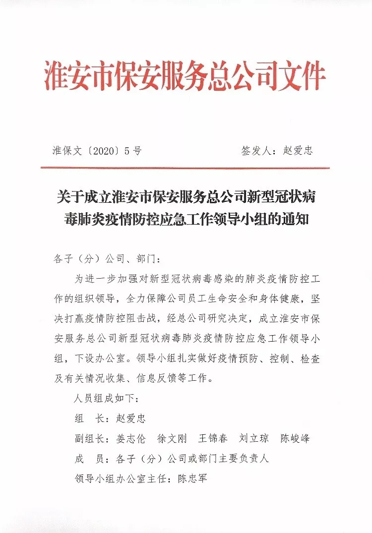 疫情就是命令,防控就是責(zé)任。總公司黨總支積極應(yīng)對,超前部署,1月26日,總公司制定并下發(fā)《淮安市保安服務(wù)總公司新型冠狀病毒感染的肺炎疫情防控應(yīng)急預(yù)案》、《關(guān)于成立新型冠狀病毒感染的肺炎疫情防控應(yīng)急工作領(lǐng)導(dǎo)小組的通知》、《致全體黨員的一封公開信》。春節(jié)期間,總公司黨總支書記、總經(jīng)理趙愛忠等領(lǐng)導(dǎo)班子多次深入基層督導(dǎo)疫情防控工作??偣纠梦⑿湃?、工作群對疫情防范工作進(jìn)行再部署、再安排、再要求,要求各級管理人員要把疫情防控作為當(dāng)前最大的政治任務(wù),切實履職擔(dān)責(zé),認(rèn)真抓好疫情防控工作,做到全員宣傳到位、措施到位、防范到位。