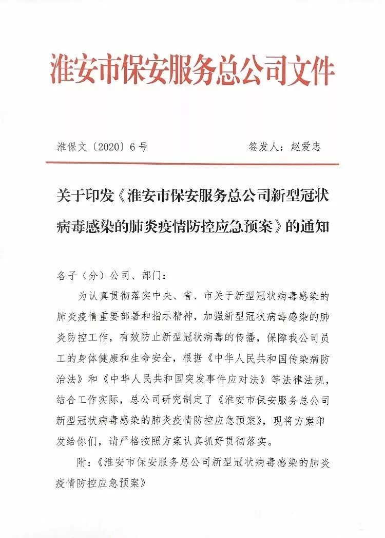 截止目前,淮安保安沒有發(fā)現(xiàn)一名員工感染新型冠狀病毒,疫情得到了有效防控。