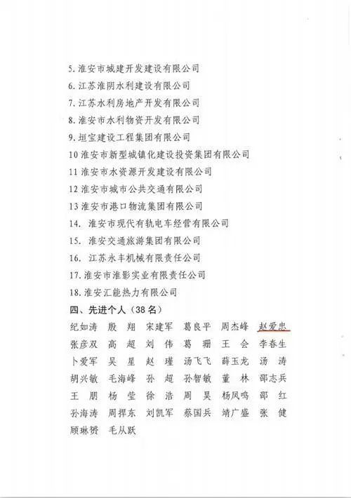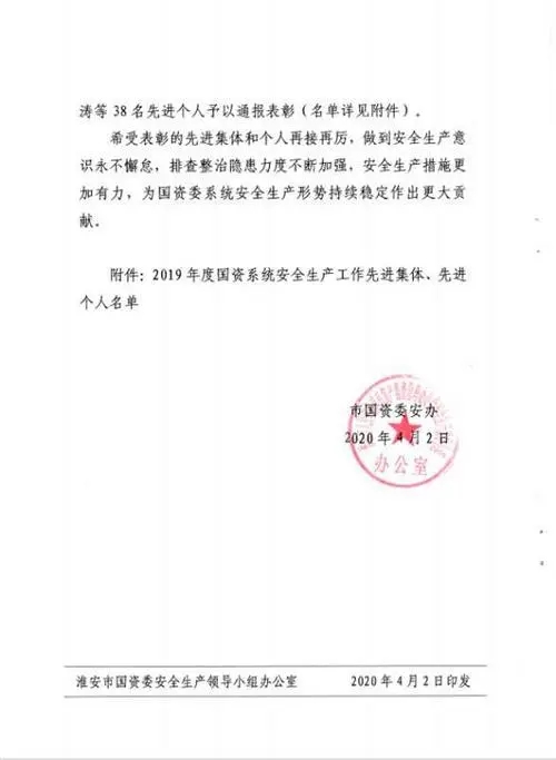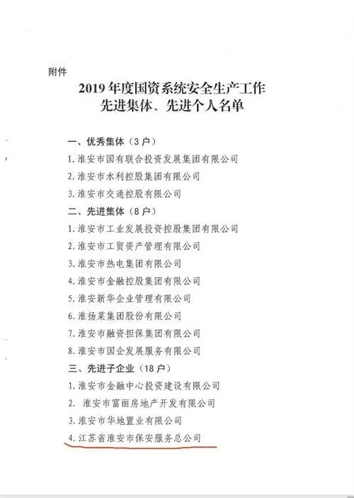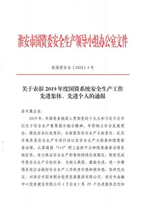2020年4月2日,淮安市國資委通報表揚(yáng)2019年度國資系統(tǒng)安全生產(chǎn)先進(jìn)集體和個人,淮安保安以“零事故”“零隱患”表現(xiàn)榮膺先進(jìn)集體。公司黨總支書記、總經(jīng)理趙愛忠榮膺先進(jìn)個人。