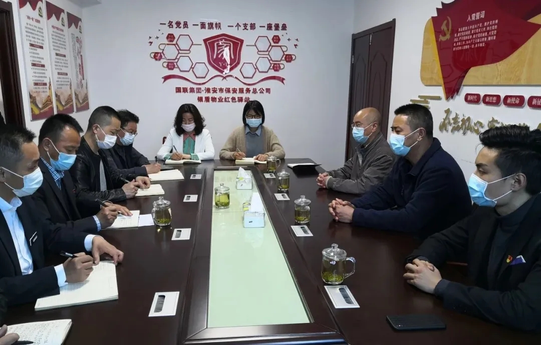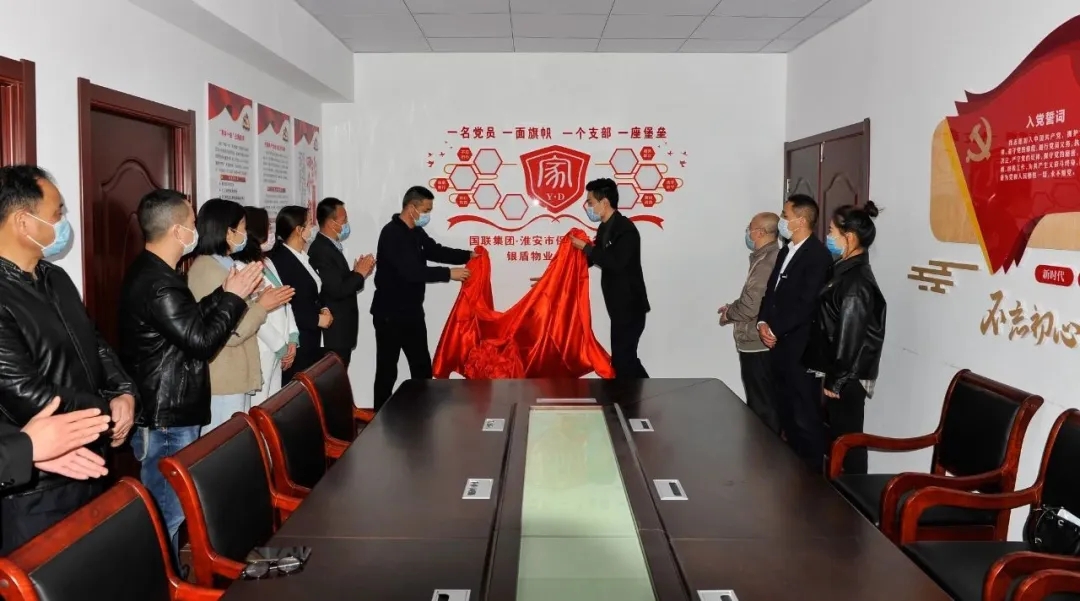 為進(jìn)一步深化國(guó)聯(lián)集團(tuán)“紅色驛站”特色黨建品牌建設(shè),發(fā)揮黨建引領(lǐng)作用, 4月28日上午,總公司下屬淮安市銀盾物業(yè)服務(wù)有限公司“紅色驛站”舉行揭牌儀式??偣军h總支書記、總經(jīng)理趙愛(ài)忠,副總經(jīng)理黃欣晨,總經(jīng)理助理陳峻峰,物業(yè)公司經(jīng)理王樹先共同為“紅色驛站”揭牌。